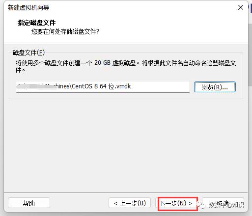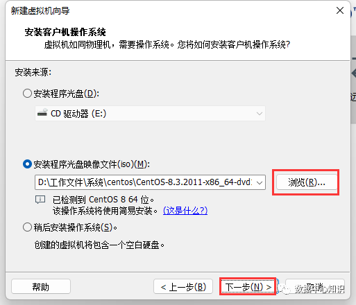 在这里,我们点击浏览找到下载好的镜像Centos-8.3,并选择,点击下一步。