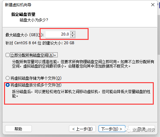 磁盘容量暂时分配默认的20G即可后期可以随时增加,取消选择立即分配所有磁盘,否则虚拟机会将20G的空间直接分配给CentOS,会导致宿主机所剩硬盘容量减少。选择将虚拟磁盘拆分成多个文件,后期使虚拟机用储存设备拷贝复制更加简单,点击下一步。