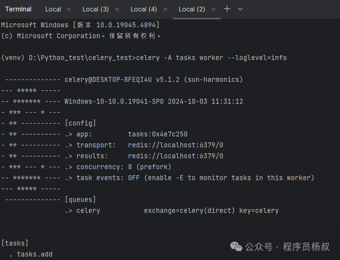 pycharm中新开一个Terminal窗口,启动一个 Celery worker 进程,以便处理任务: