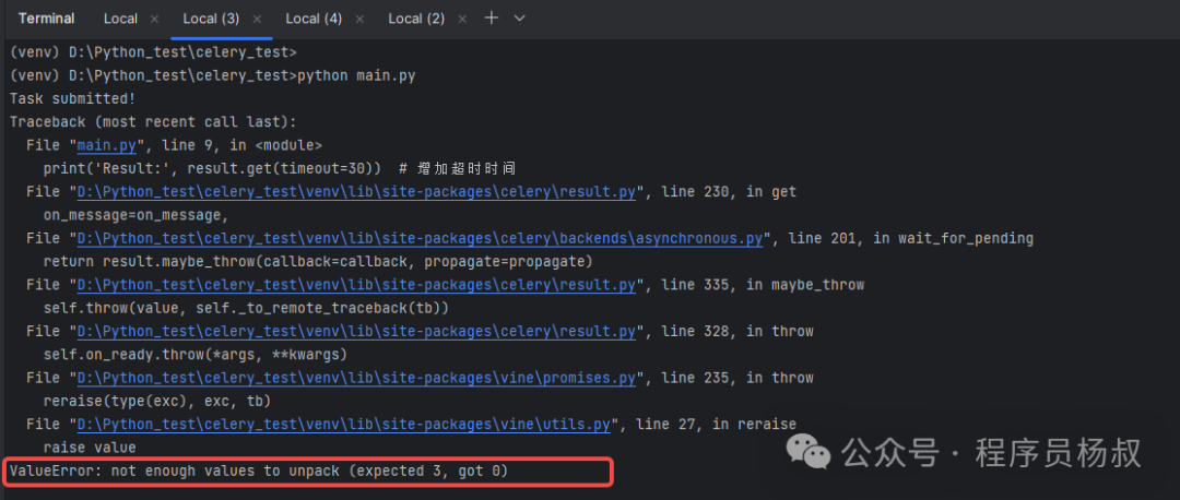 这里的delay方法用于将任务发送到 Celery 队列中进行异步执行。result.get()方法用于获取任务的执行结果,如果任务还没有执行完成,它会阻塞直到任务完成并返回结果。