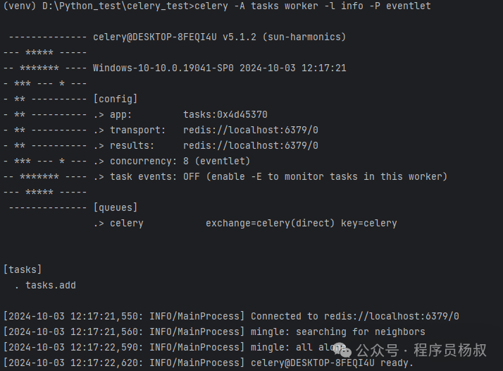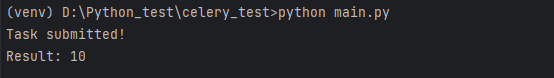 from tasks import addif __name__ == '__main__':result = add.delay(4, 6) # 异步调用任务print('Task submitted!')# 等待任务完成并获取结果print('Result:', result.get(timeout=10)) # 增加超时时间