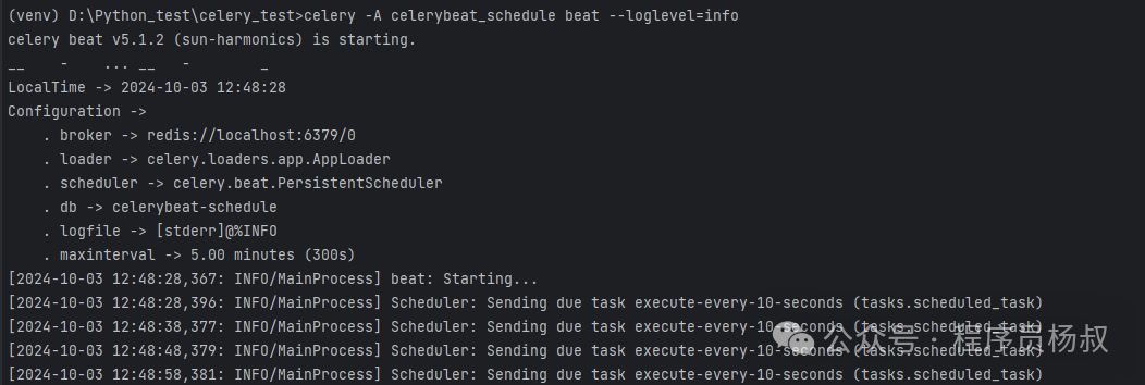 在Celery Beat窗口,你会看到每10秒都会执行一次任务调度: