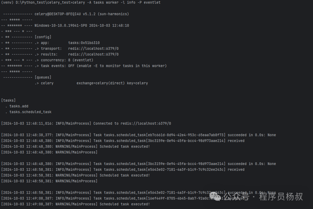 然后在Celery Worker窗口,你会看到对应的每隔10秒都会正确调用我们上面写的"scheduled_task"方法,打印文案"Scheduled task executed!":