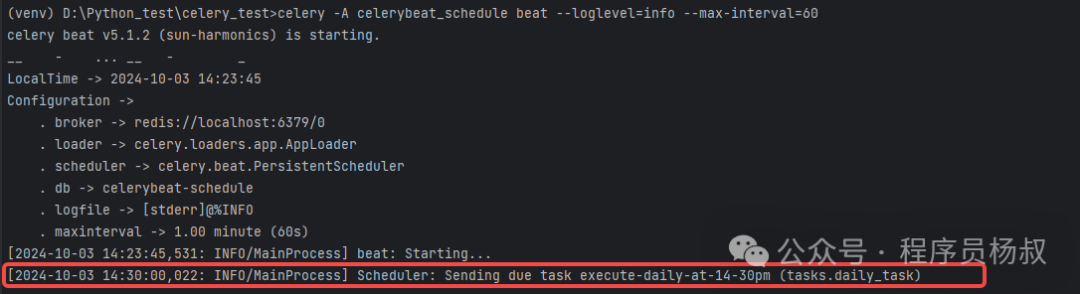然后新开一个Terminal窗口,启动Celery Beat,开始调度你的定时任务:
