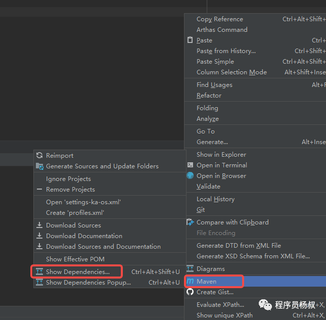 项目pom.xml文件中,鼠标右键》maven》Show Dependencies,查看各个依赖间的关系图: