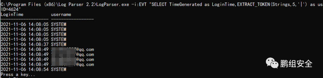 LogParser.exe -i:EVT "SELECT TimeGenerated as LoginTime,EXTRACT_TOKEN(Strings,5,'|') as username FROM d:\log\test.evtx where EventID=4624"