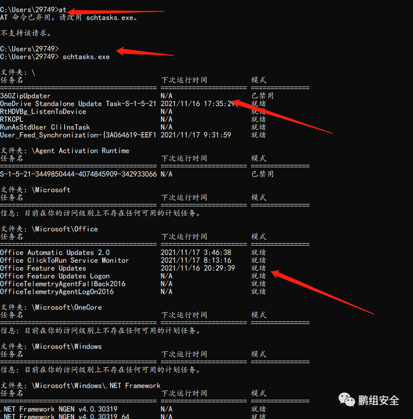 cmd中输入 at(有些是输入schtasks.exe),查看计算机与网络上的其它计算机之间的会话或计划任务是否可疑。