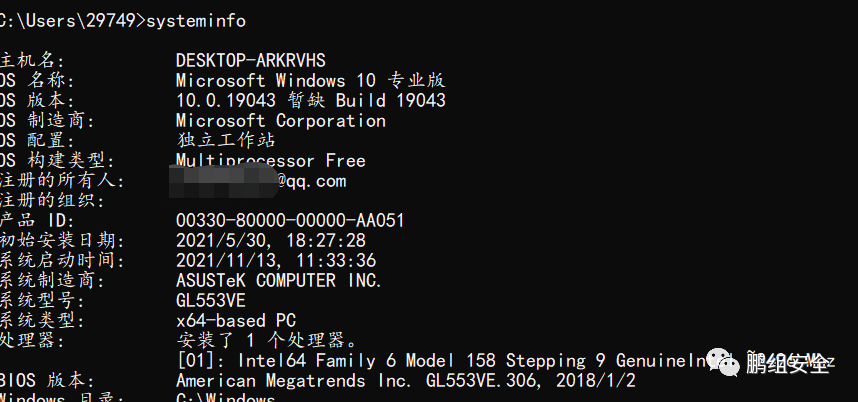 cmd中输入 systeminfo,查看系统信息。