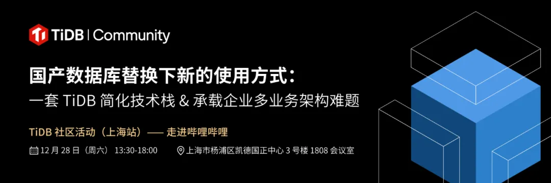 国产数据库选型需要考虑哪些方面的因素?技术栈怎样才能更加简洁好用高效?TiDB 社区的小伙伴们,12 月 28 日,TiDB 社区活动(上海站)来啦!让我们一起相约走进哔哩哔哩,探索国产数据库替换下新的使用方式——用一套 TiDB 承载多业务架构,简化技术栈的收益和实践吧!