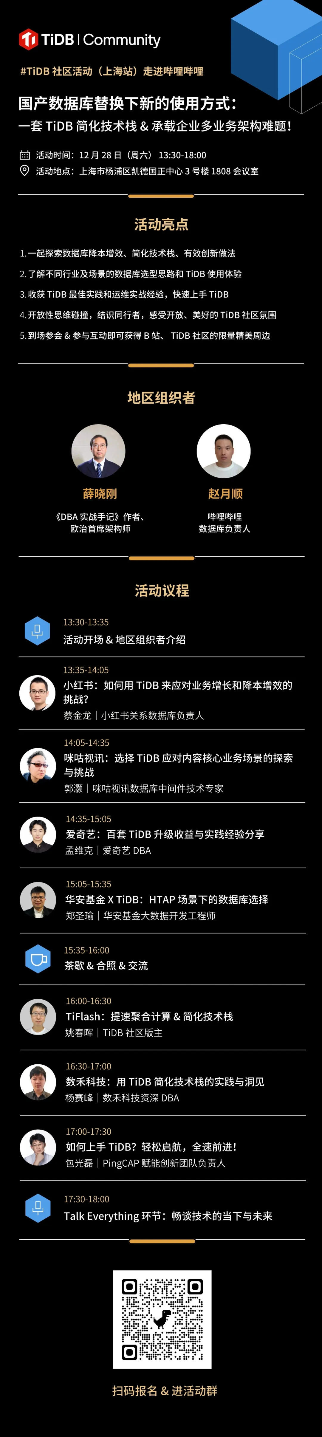 特别感谢 TiDB 上海地区组织者薛晓刚老师、赵月顺老师的精心筹备,也非常期待七位嘉宾老师们即将带来的深度且真诚的分享,欢迎 TiDBer 们线上/线下参加,在活动中找到自己想要的答案!
