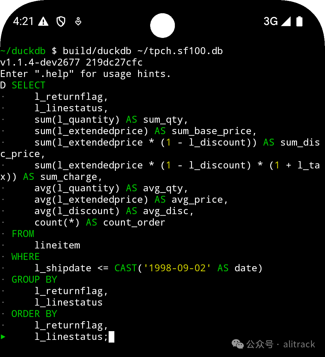 我们在Termux终端模拟器[5]中运行DuckDB。我们根据Android构建说明[6]从源码编译了DuckDB CLI客户端[7],并在命令行中运行实验。