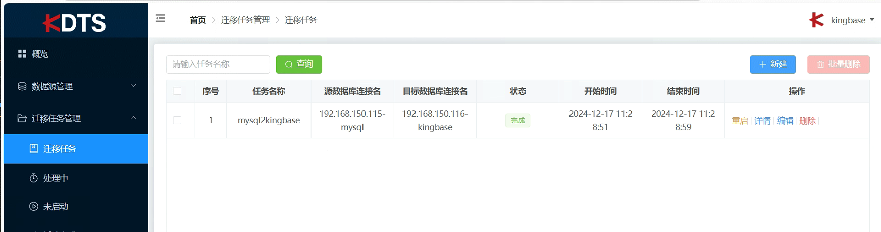 点击保存并启动后就开始了迁移任务,可以再迁移任务里看到迁移任务,点击详情查看任务的详细信息