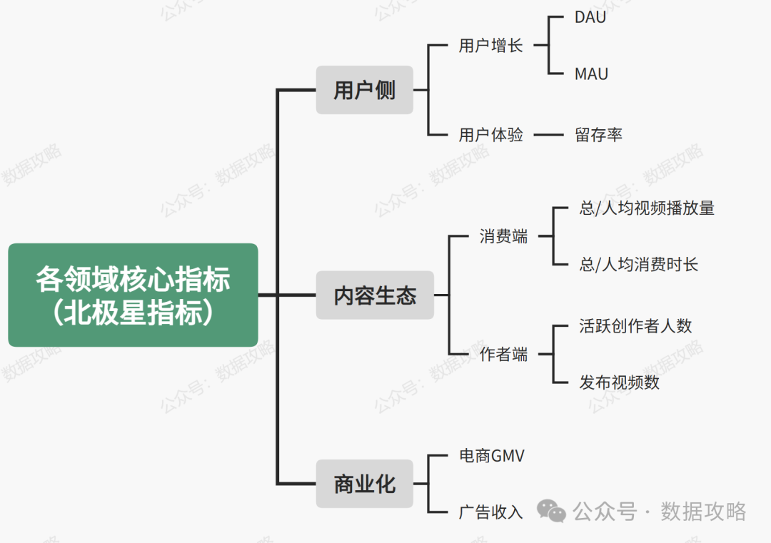 用户侧(包含用户数量和质量两方面) 内容生态(包含内容消费端、创作者端) 商业化(包含广告收入、电商收入等)等
