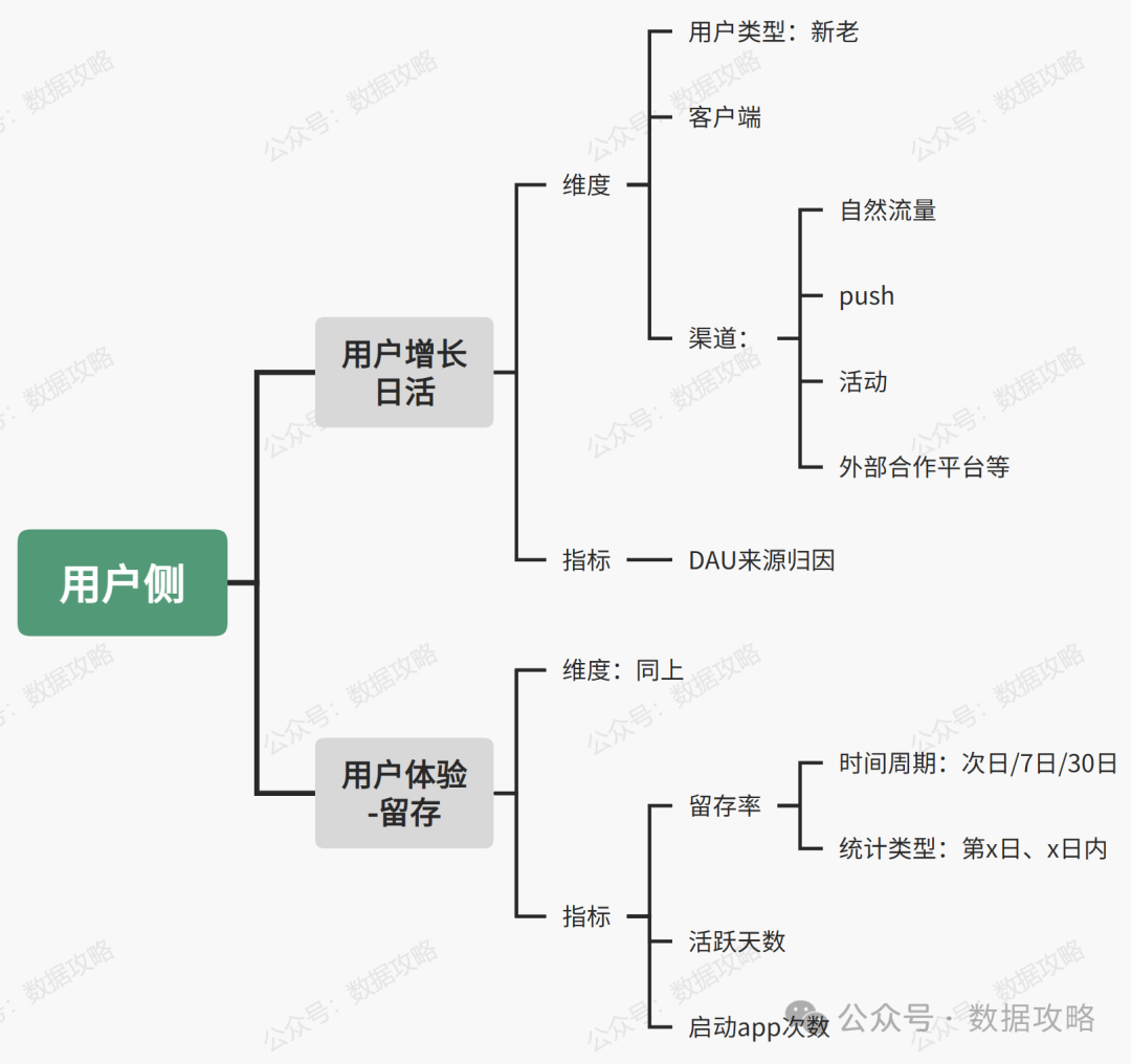增长相关:DAU、MAU 用户体验相关:留存率
