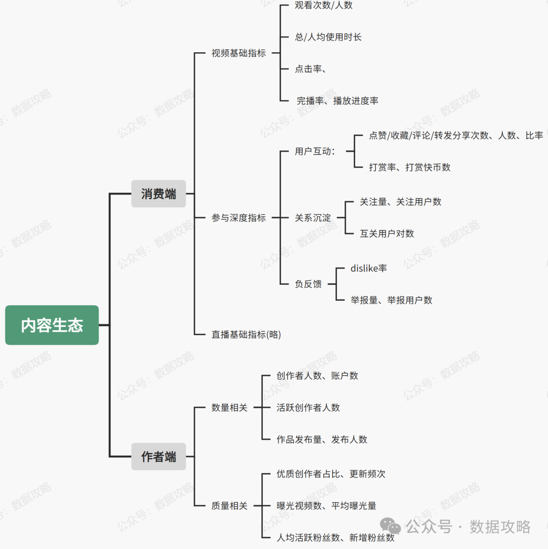 内容消费端:总/人均视频播放量、总/人均消费时长 创作者端:活跃创作者数量、作品发布数