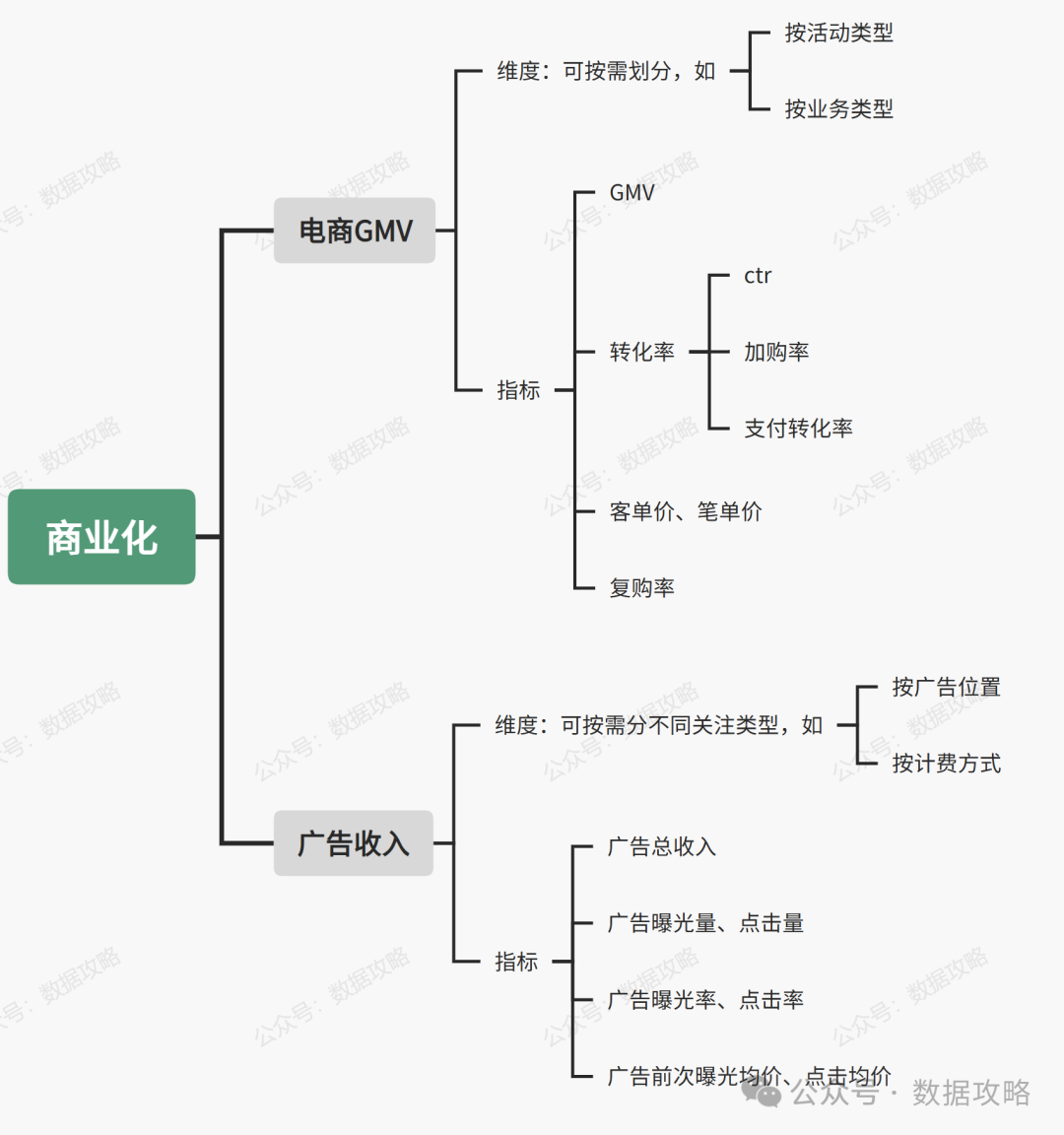 每一个方向细分不同领域,有不同细分业务逻辑,对应有具体的业务策略S-Strategy,所以相应关注的指标除上述外,还有一些更为详尽的子指标、过程指标,可根据实际业务关注情况做近一步拆解去完善设计。