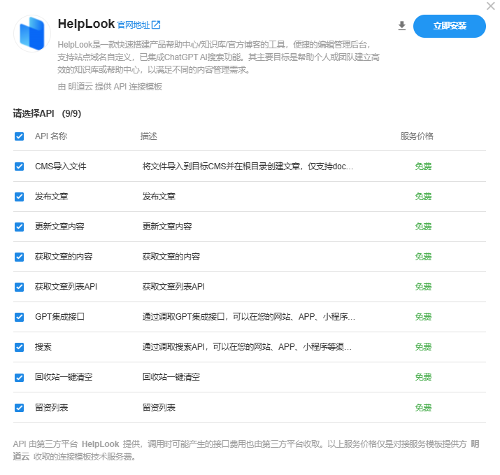 目前,明道云和HelpLook的9个常用业务接口已经预置集成。如有更多需求场景,可按需继续扩充。