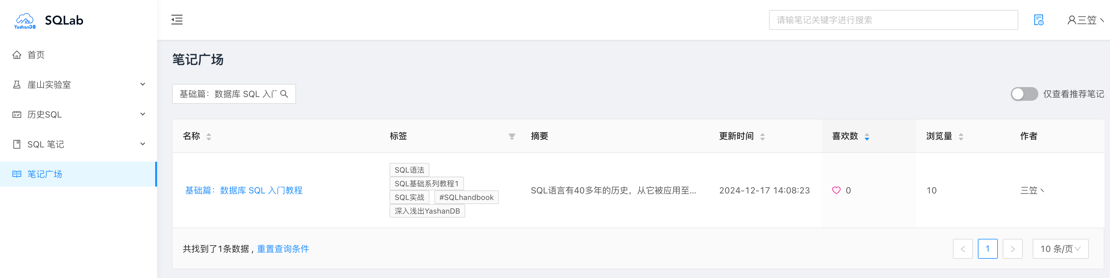 记得之前不少朋友问我有没有一些在线的 SQL 实验网站,用来学习一些 SQL 基础语法和学习测试。今天发现一款崖山数据库的在线 SQL 学习与分享平台:
