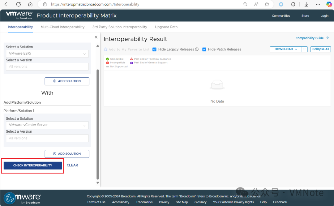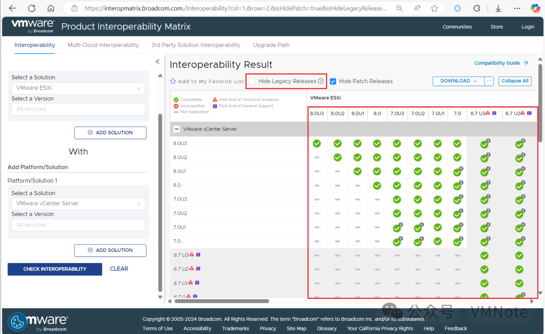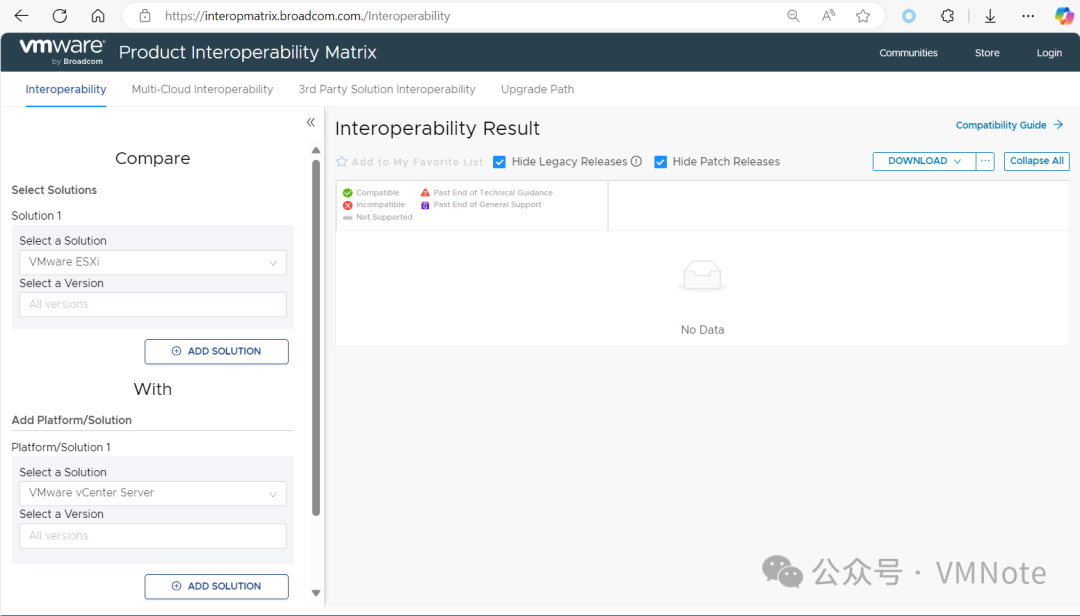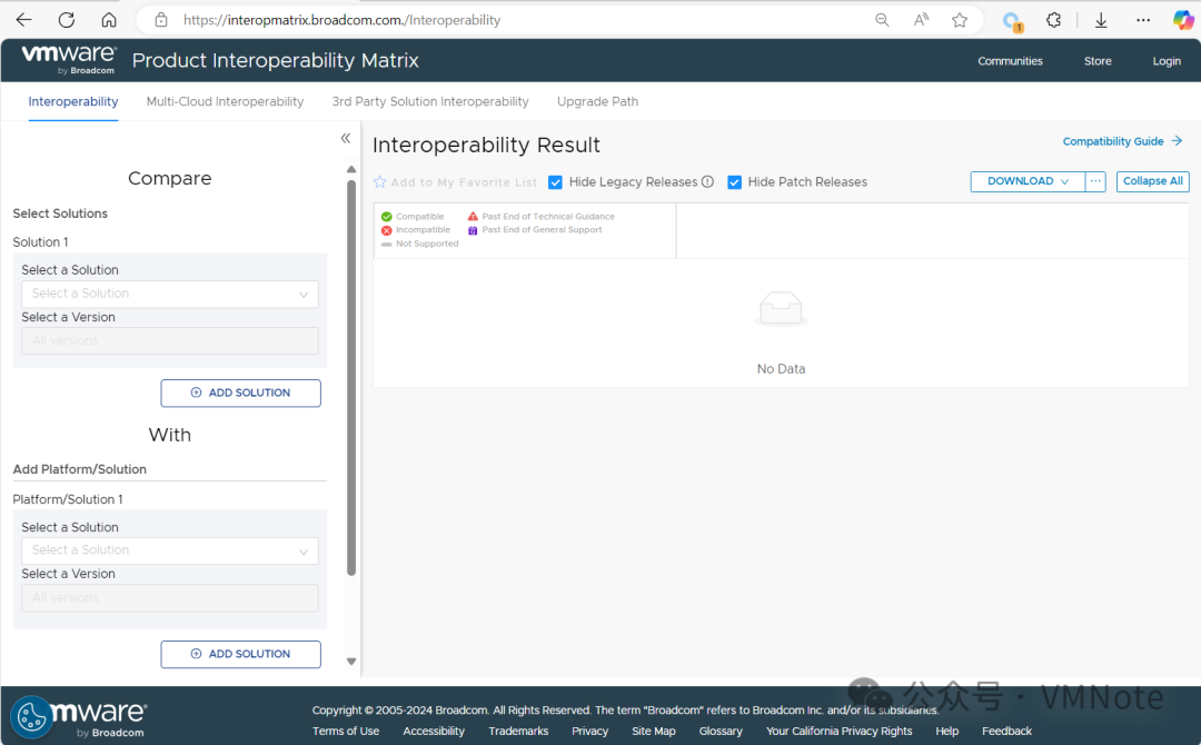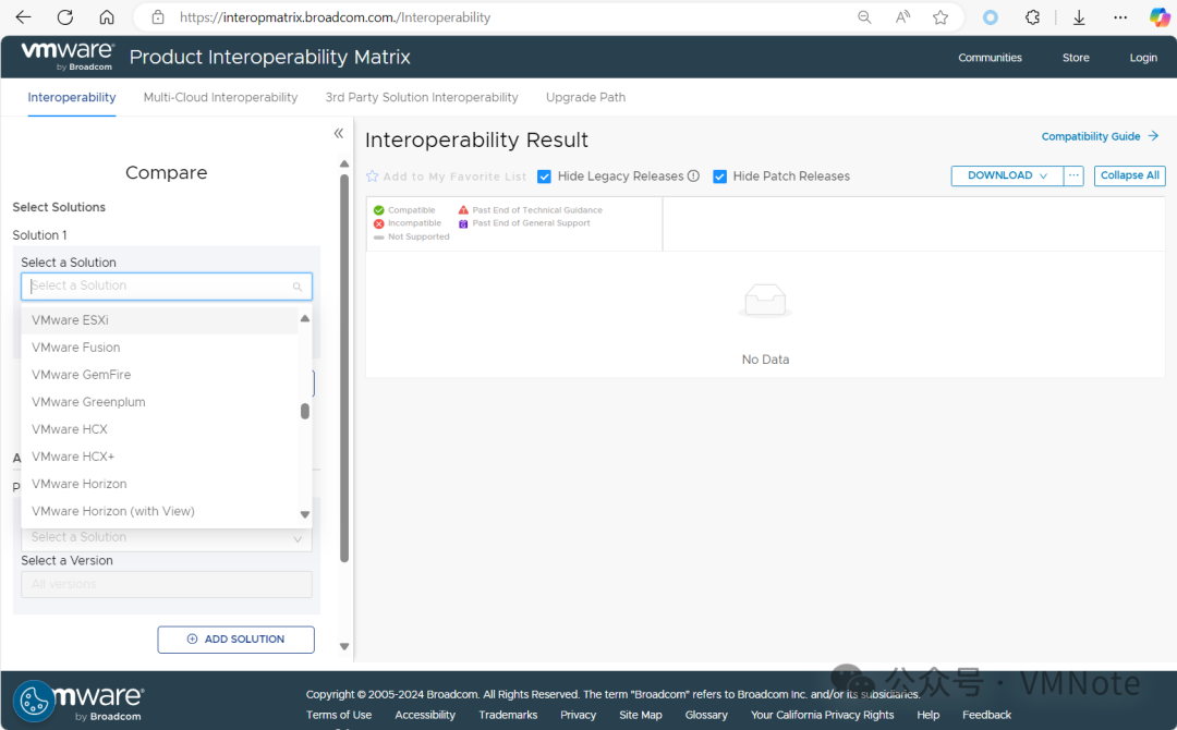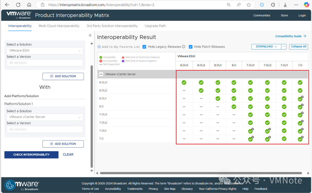 本文以查找VMware vCenter Server 与 ESXi之间的兼容性为例,介绍如何在博通网站查询VMware产品之间的兼容性