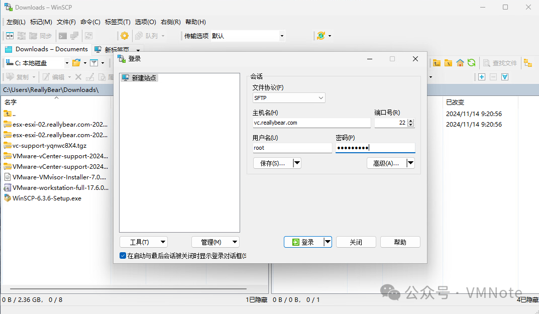 第3步,打卡WinSCP软件,并输入vCenter的域名或IP地址以及用户root的密码进行登录
