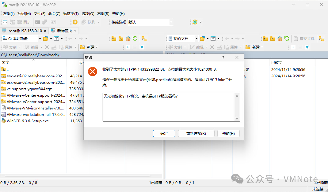 “收到了太大的SFTP包,支持的最大包大小为1024000 B”
