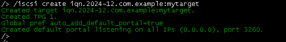 /> /iscsi create iqn.2024-12.com.example:mytarget