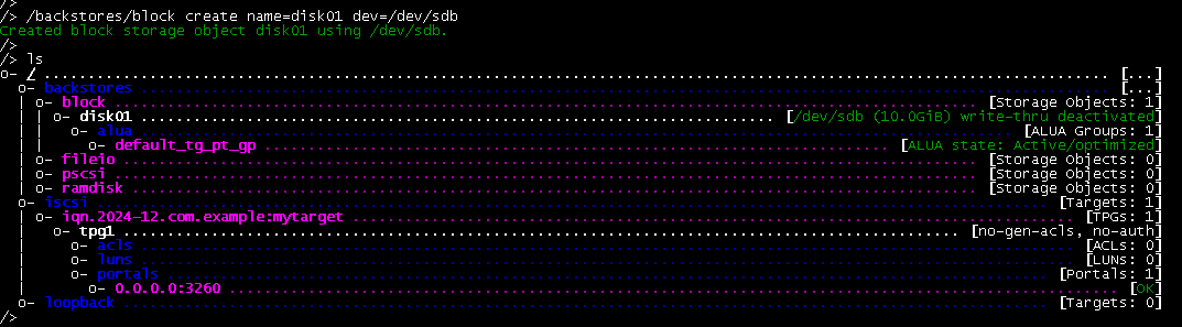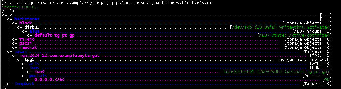 /> /iscsi/iqn.2024-12.com.example:mytarget/tpg1/luns create /backstores/block/disk01