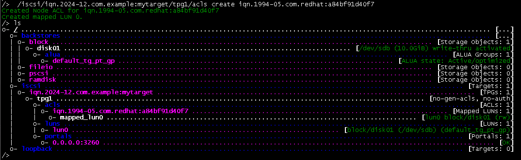 /> /iscsi/iqn.2024-12.com.example:mytarget/tpg1/acls create iqn.1994-05.com.redhat:a84bf91d40f7