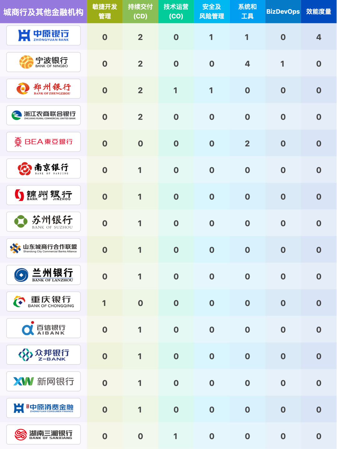 城商行及其他金融机构通过 DevOps 国内标准(《研发运营一体化( DevOps )能力成熟度模型》)评估数量如下:
