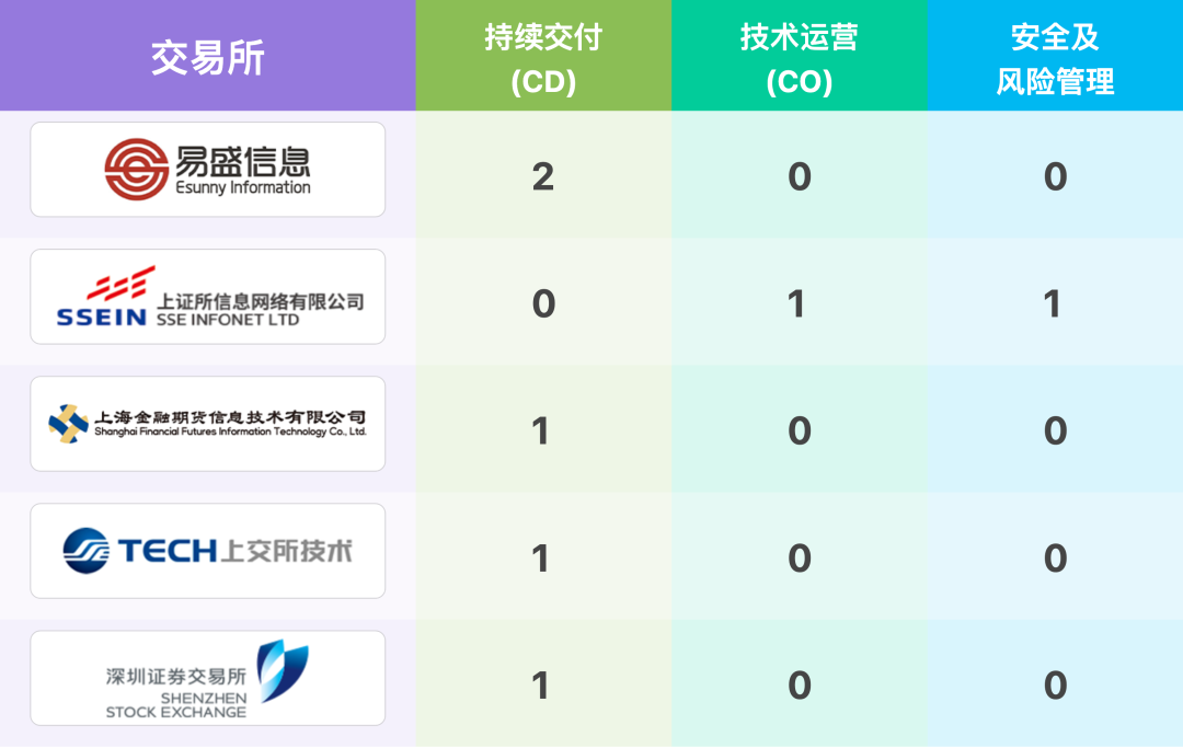 交易所通过 DevOps 国内标准(《研发运营一体化( DevOps )能力成熟度模型》)评估数量如下: