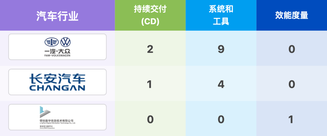 汽车行业通过 DevOps 国内标准(《研发运营一体化( DevOps )能力成熟度模型》)评估数量如下: