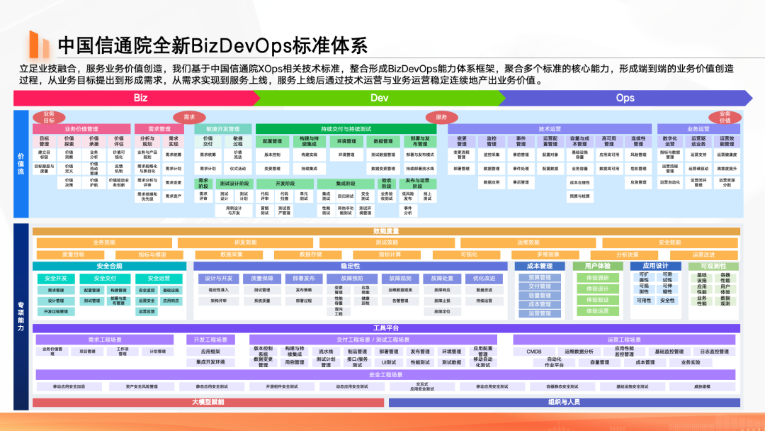 中国信通院全新 BizDevOps 标准体系立足业技融合,服务业务价值创造,是基于中国信通院 XOps 相关技术标准(DevOps、DevSecOps、FinOps 等),整合形成的 BizDevOps 能力体系框架,聚合多个标准的核心能力,形成端到端的业务价值创造过程,从业务目标提出到形成需求,从需求实现到服务上线,服务上线后通过技术运营与业务运营稳定连续地产出业务价值。