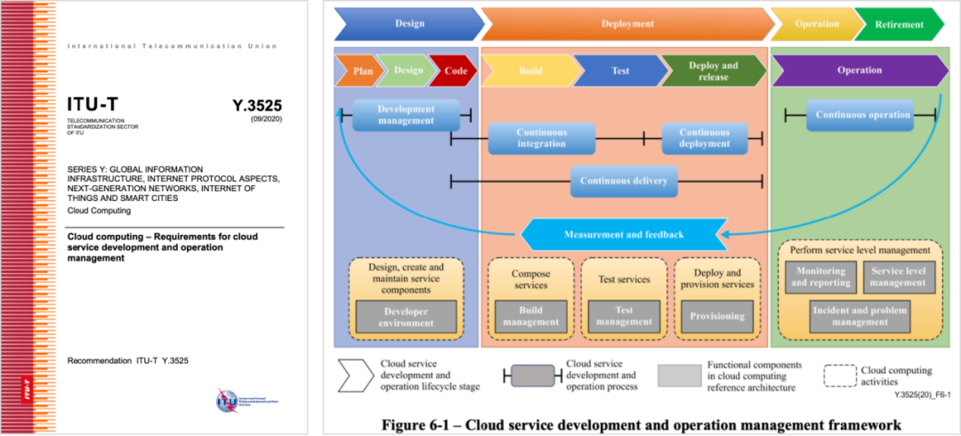 与此同时,DevOps 标准已于2020年7月在联合国直属标准化组织 ITU-T 正式结项并可正式评估(标准号:ITU-T Y.3525 )。研发运营一体化(DevOps)总体架构可划分过程(敏捷开发管理、持续交付、技术运营)、应用设计、安全及风险管理、系统和工具、业务价值管理、合作开发运维、持续测试、效能度量、平台工程、系统可靠性与连续性工程等。