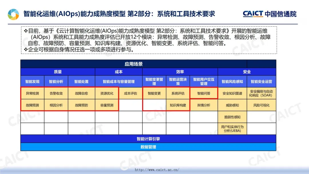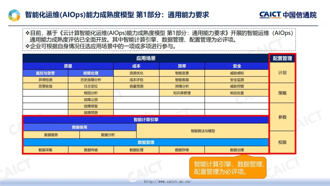 目前,基于“智能化运维能力成熟度系列标准 第1部分:通用能力要求”开展的智能运维(AIOps)通用能力成熟度评估已全面开放。其中智能计算引擎、数据管理、配置管理为必评项。