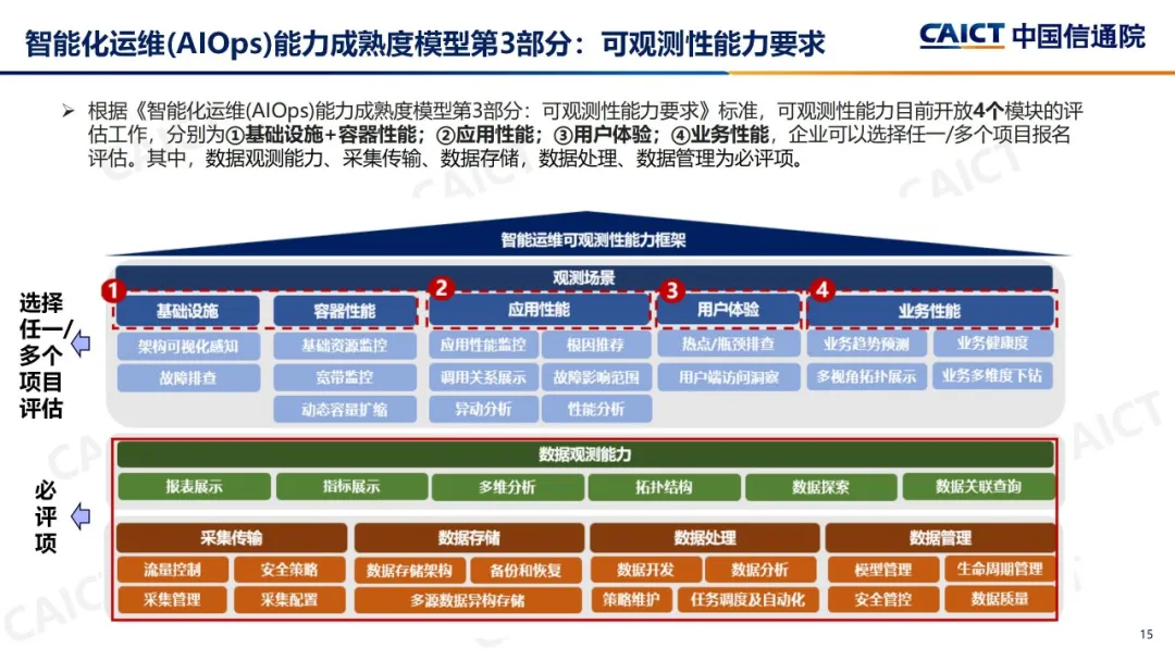 基于“智能化运维能力成熟度系列标准 第3部分:可观测性能力要求”开展的智能运维(AIOps)可观测性能力成熟度评估已开放4个模块:分别为基础设施+容器性能、应用性能、用户体验、业务性能。