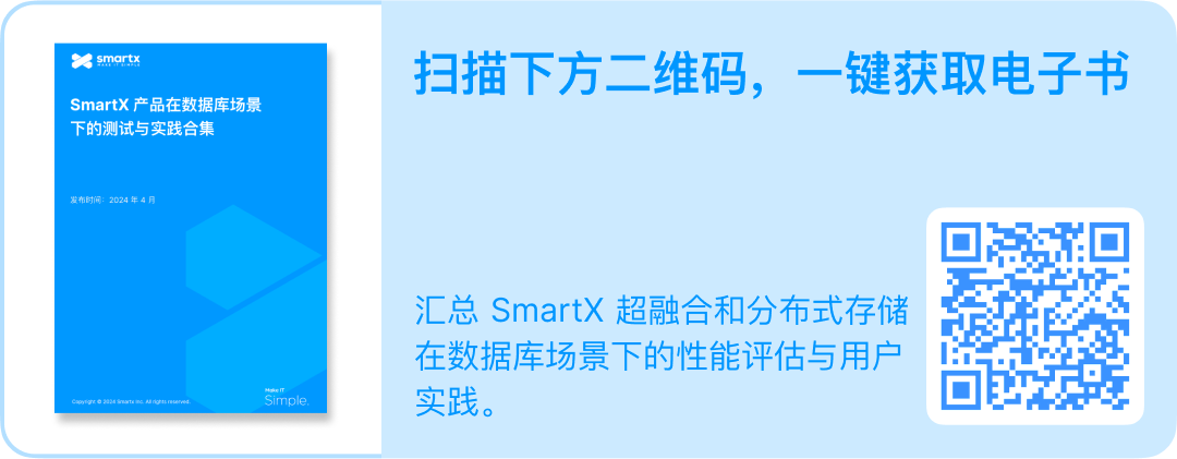 更多数据库场景性能评测,欢迎扫码下载《SmartX 产品在数据库场景下的测试与实践合集》。
