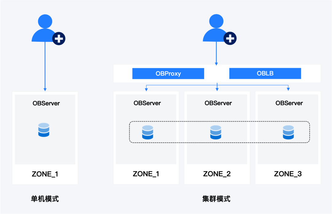 OceanBase 集群是由 3 台或以上的服务器组成,业务访问请求会通过数据库的负载均衡组件分散至多个 OB 服务器节点中进行处理,充分利用多台服务器节点的运算能力提升数据库的整体性能。生产环境中 OB 也是以集群的形式进行部署为主。