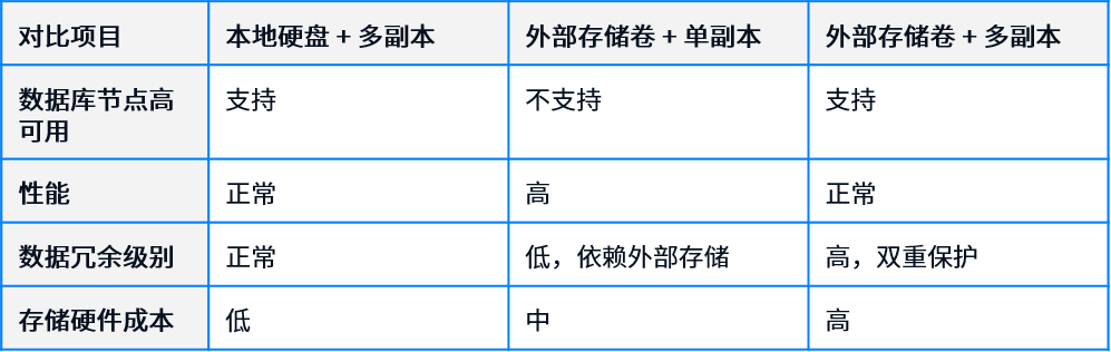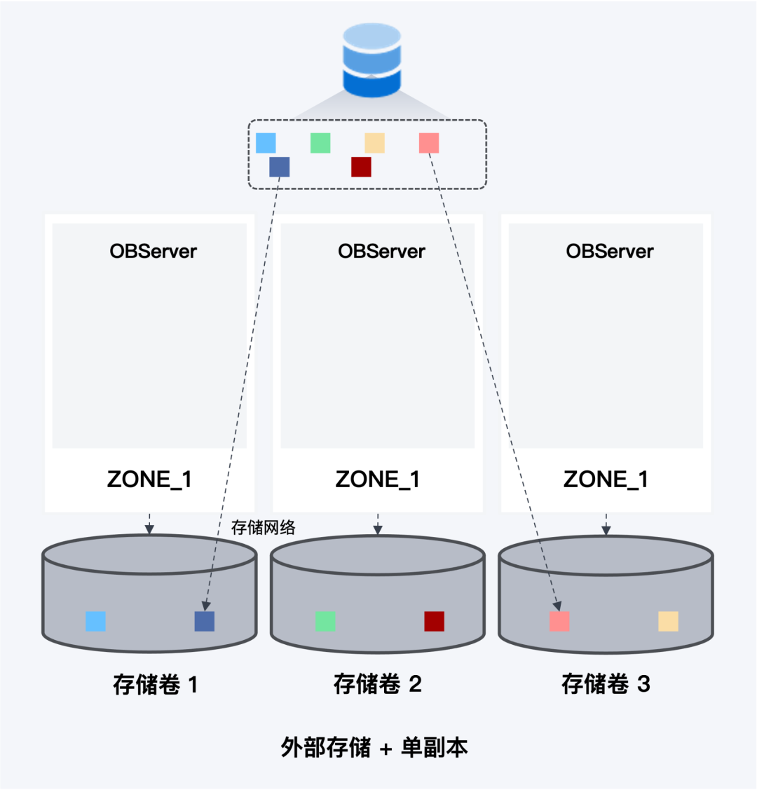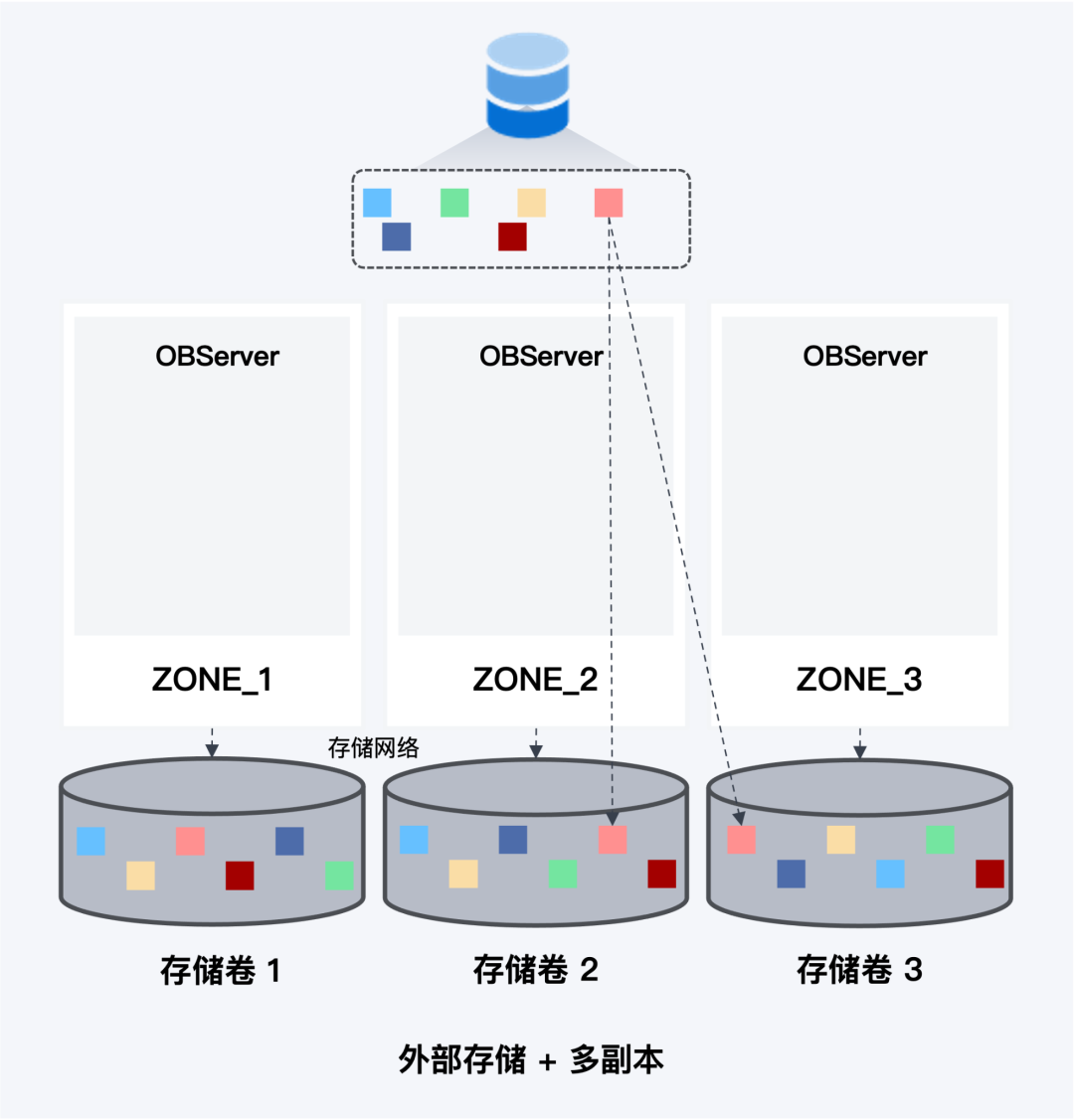 这种存储方案比较特别:每台 OB 服务器节点都分别连接外部存储卷(存储卷自身有冗余机制),同时在 OB 层面也启用了多副本(副本冗余机制);相当于存储层面有两重冗余机制,数据可靠性非常高,但存储硬件成本也会随之上升。