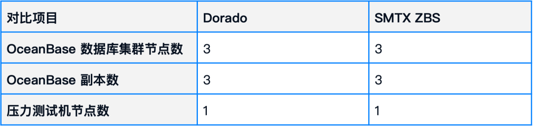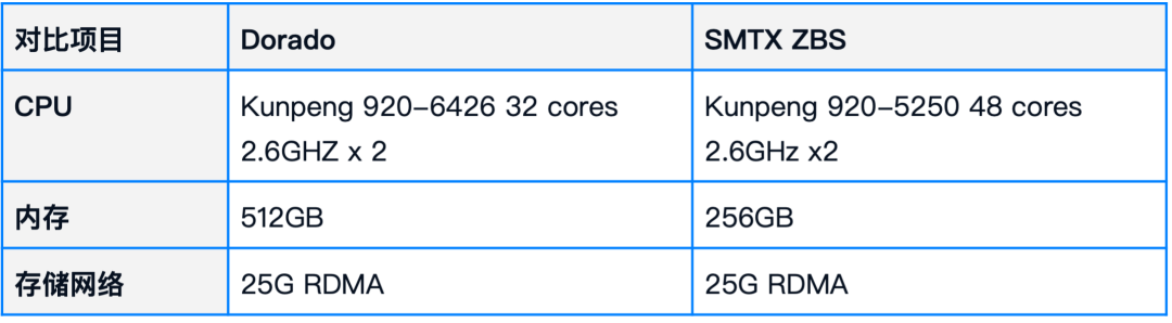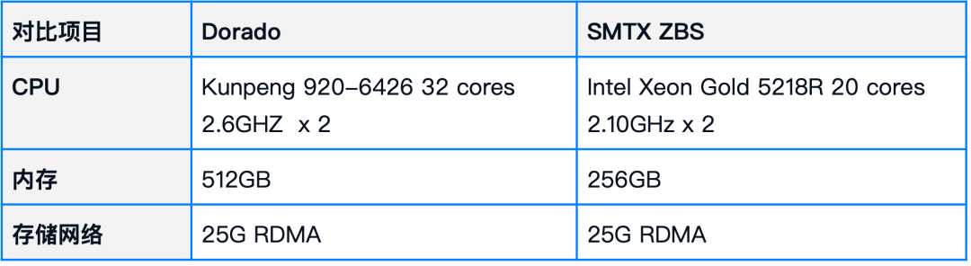 服务器 CPU 型号不一致:其中 Dorado 对应的服务器 CPU 核数是 32,而 SMTX ZBS 对应的服务器 CPU 核数为 48,两者的主频均为 2.6GHz。因此,Dorado 的 CPU 核心数约为 SMTX ZBS 的 67% 。 服务器内存容量不一致:其中 Dorado 对应的服务器内存为 512GB,而 SMTX ZBS 对应的服务器内存为 256GB。因此, Dorado 对应数据库服务器内存容量是 SMTX ZBS 的 2 倍。