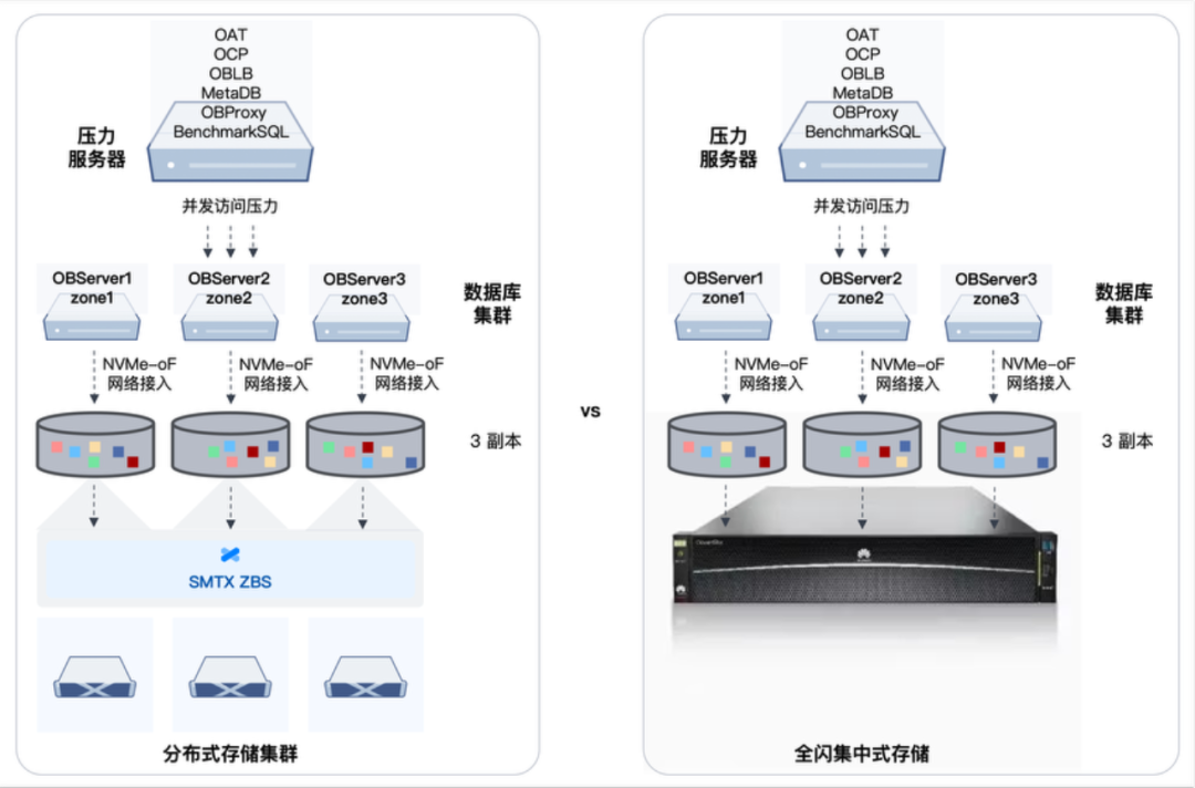 测试对象:采用 1 副本与 3 副本的 3 节点 OB 集群(SMTX ZBS 采用 2 副本)共两组对象。