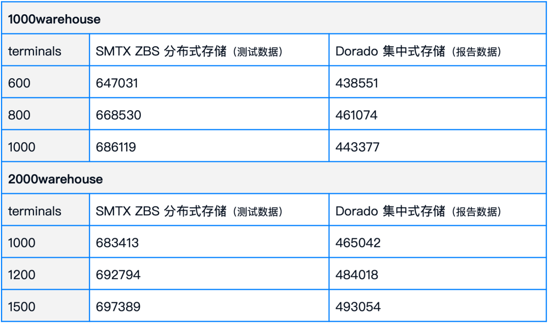 为了进一步验证 SMTX ZBS 支持 OceanBase 的性能,我们参考了金融信息化研究所与华为联合发布的《基于 OceanStor Dorado 的 OceanBase 数据库存算分离最佳实践》中相近配置方案下以 Dorado 5600 作为 OceanBase 外部存储的 TPC-C 性能数据,并基于该数据与 SMTX ZBS 实测性能数据进行对比,供读者参考。