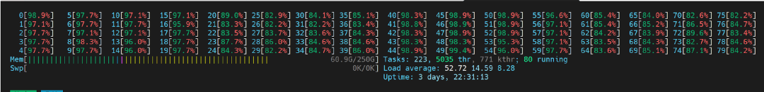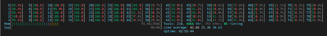 优化后:0-79 各个核心利用率比较均衡(没有出现 100% 利用率的核心),充分发挥 CPU 性能