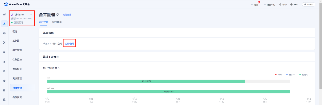 5. 在执行性能测试之前(运行 ./runBenchmark.sh prop.oceanbase 命令之前),需要在 OCP 上对数据库的数据发起合并,等待合并完成之后再执行 ./runBenchmark.sh prop.oceanbase 命令进行性能测试,合并后性能约可提升 10%,合并方法如下图所示: