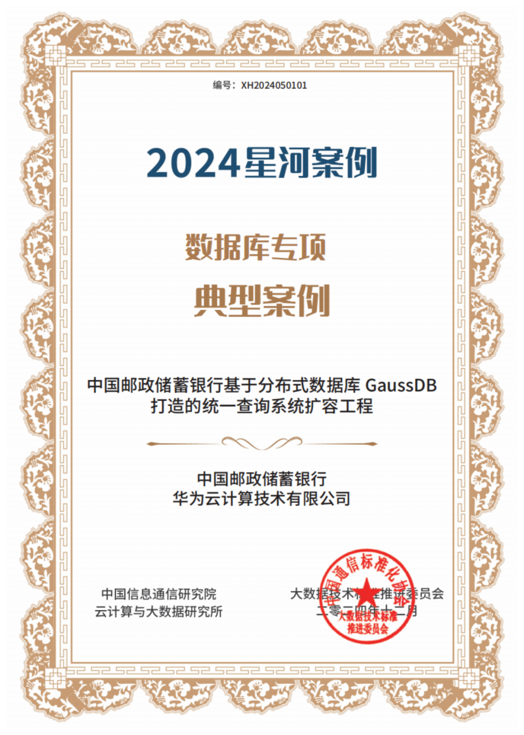 在大会的第八届大数据“星河”案例典型案例证书颁发环节,“中国邮政储蓄银行基于分布式数据库GaussDB打造的统一查询系统扩容工程”荣获数据库专项典型案例。