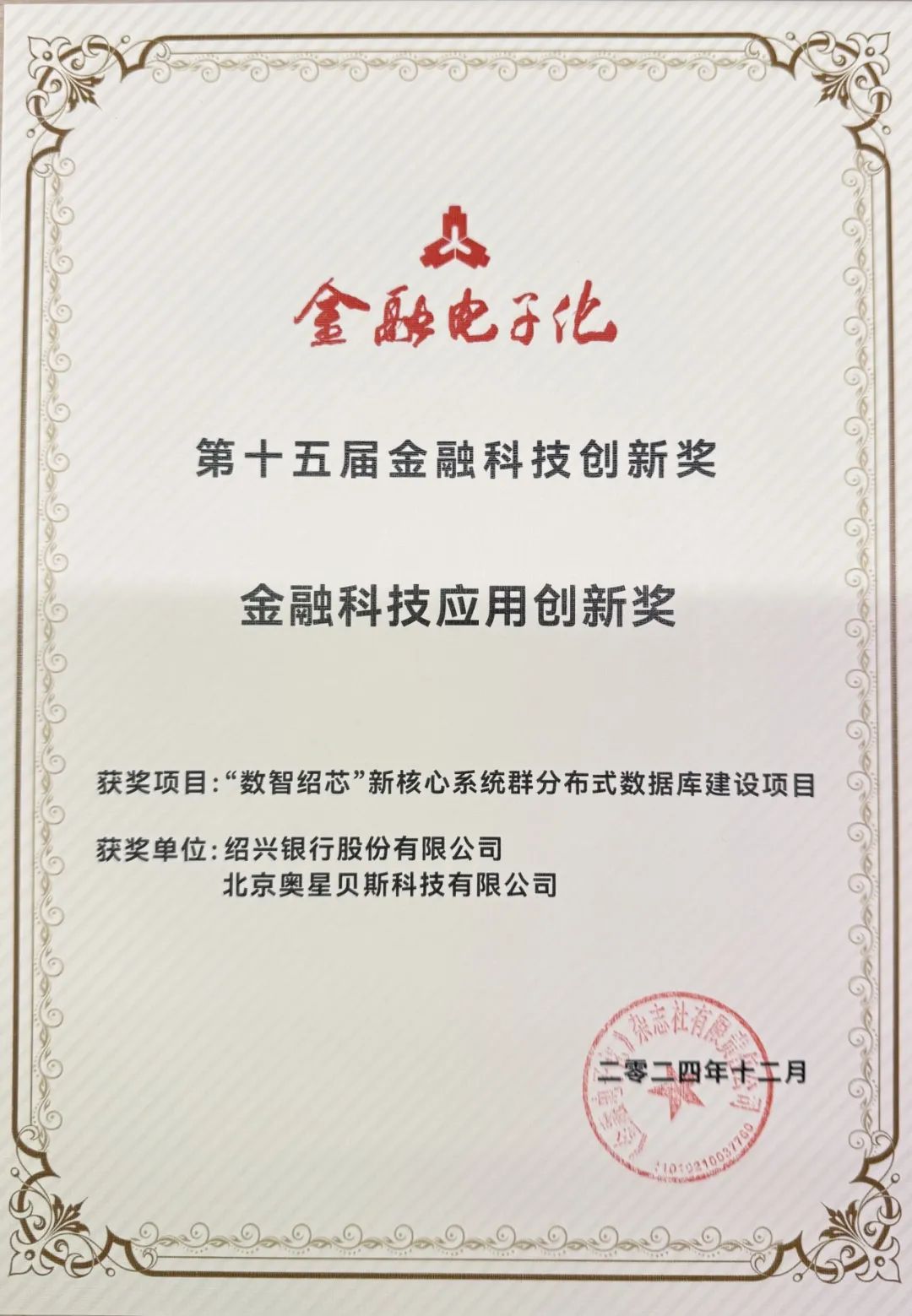 在本届金融科技创新奖颁奖典礼上,绍兴银行携手 OceanBase 打造的“数智绍芯”新核心系统群分布式数据库建设项目脱颖而出,荣获第十五届金融科技创新奖“金融科技应用创新奖”。