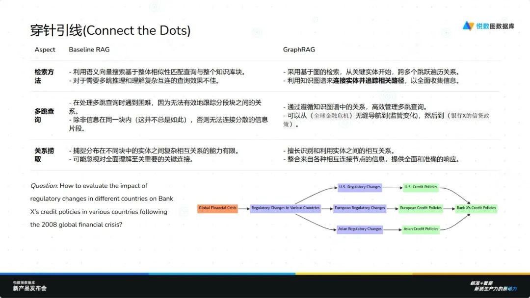 Graph RAG 是一种结合图数据库特性和自然语言处理模型的技术框架,旨在通过构建和利用知识图谱来提升信息检索的质量。相比于传统的文本索引方法,Graph RAG 更擅长捕捉实体之间的关联关系,并能有效应对“细粒度分割”、“穿针引线”以及“全局性”等挑战。例如,在面对需要综合考虑多个因素或跨越多跳关系的问题时,Graph RAG 可以更精准地找到相关知识点并建立联系,从而给出更为合理的答案。