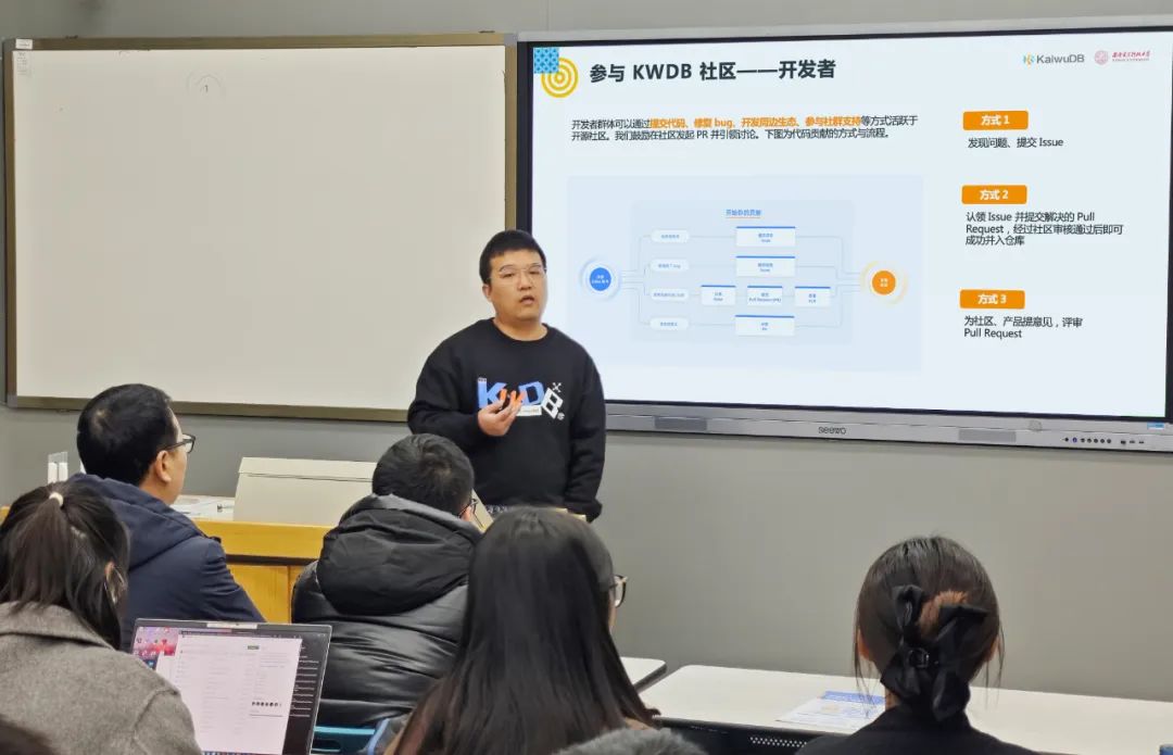 KaiwuDB 架构专家赵衎衎首先围绕数字化时代我国基础软件产业发展趋势变化及当前数据库人才需求方向等热门话题与在校师生展开分享,帮助同学们对数据库产业整体现状建立起全局认知。随后,详细介绍了 KWDB 在多模、时序数据处理、分布式等方面的技术创新及突出优势,以及在智慧工厂、数字能源、政务交通等多领域的应用成果。