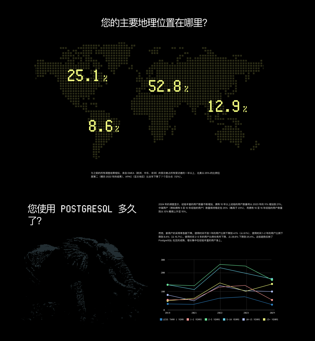 这份报告的样本数偏少,且主要集中在欧洲区域。使用 PostgreSQL 1 - 10 年的样本数量下降,拥有10 ~ 15 年经验的用户数量基本持平, 15+ 年以上的用户数量增加。