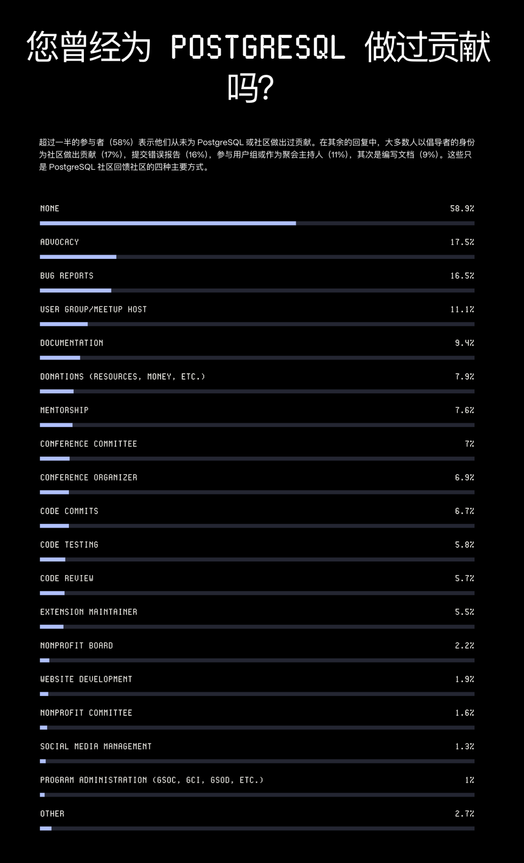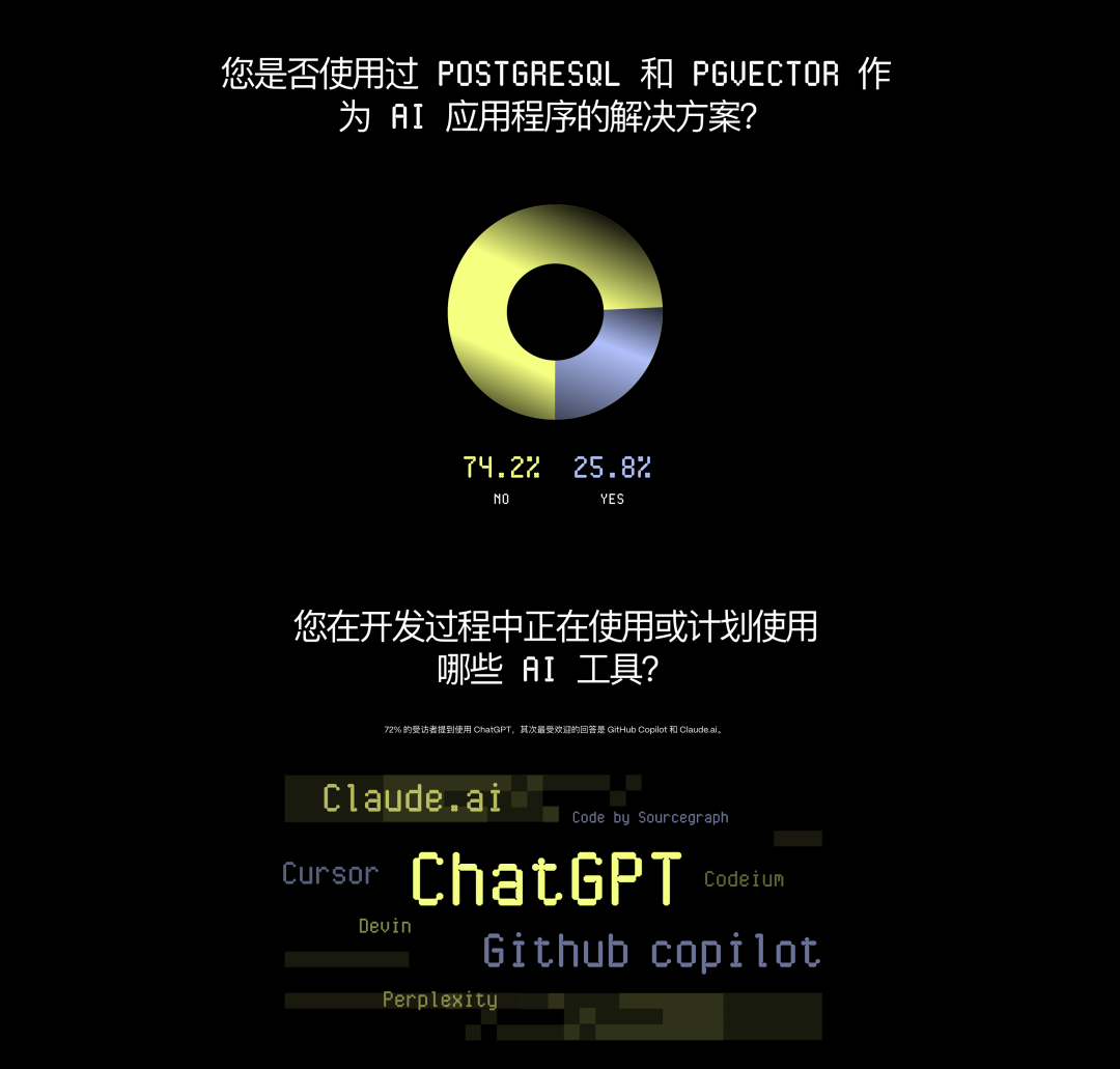 比较可惜的是这份问卷没有多问问有多少用户是因为向量扩展(PGVECTOR,VECTORSCALE, PG_VECTORIZE,VCHORD)而使用 PG 的。