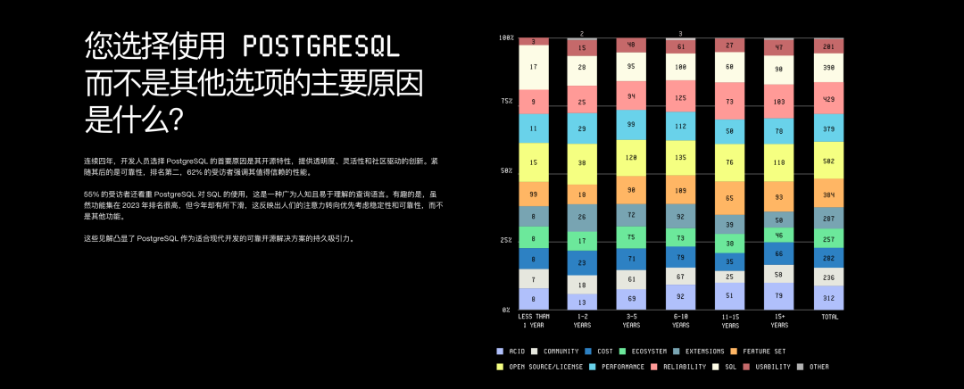 来自 TimescaleDB 的 PostgreSQL 社区年度调研反映出,用户选择 PostgreSQL 的首要因素便是 开源 与 稳定。